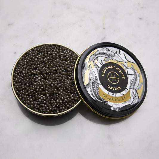 China · Huso huso Pearl size 3.3–3.5 mmLighter grey with pronounced marbling. Low salinity with marine mineral and cream.Silk texture.